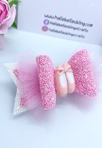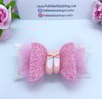 Stunning pink and white tutu ballerina hair bow, with pink ballerina shoes embellishment. This is a statement hair bows for any princess.